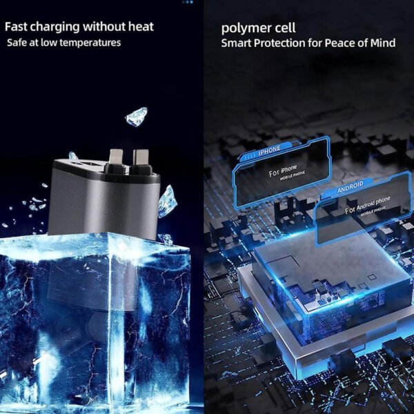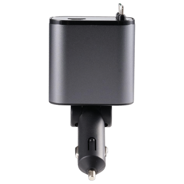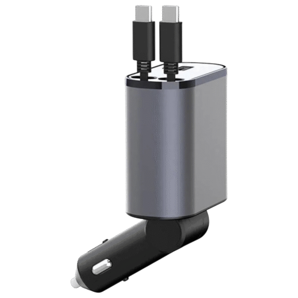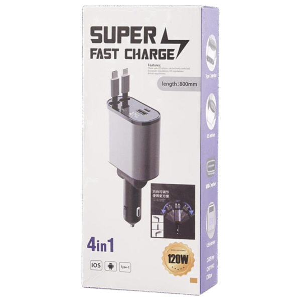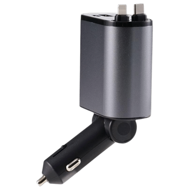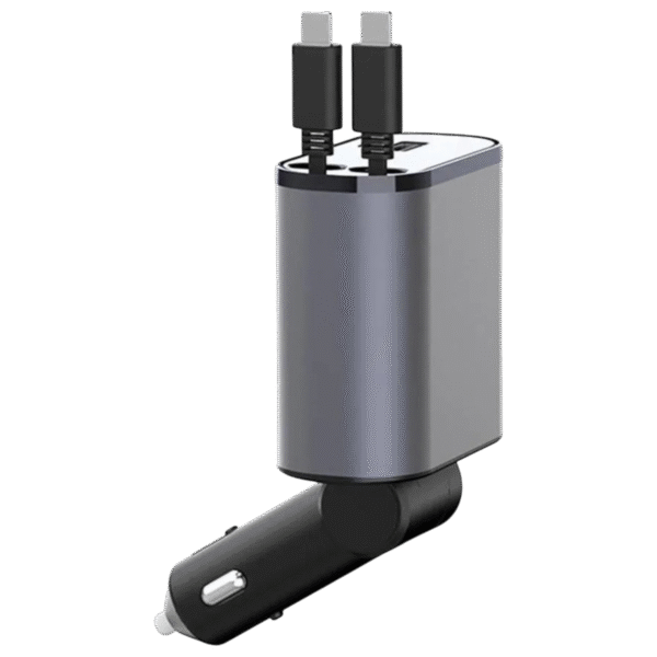 Chargeur de voiture rétractable 4 en 1 – 100W, avec câble USB-C/Lightning, multi-ports USB et protection intelligente. Compatible iPhone & Android.