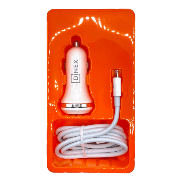 Dinex A570 : chargeur de voiture 38W à double port (USB-C + USB-A) avec câble Type-C to Lightning. Compact, rapide et sécurisé.