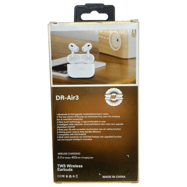 Les DORA DR-Air3 sont des écouteurs sans fil TWS nouvelle génération équipés du Bluetooth 5.2, d’un boîtier de charge 400mAh, d’une réduction intelligente du bruit, d’un contrôle tactile moderne et d’une compatibilité totale avec iOS et Android.