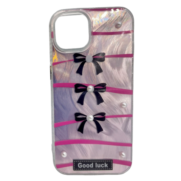 Cette coque transparente brillante présente un fond nacré texturé avec des reflets arc-en-ciel, sublimé par trois nœuds noirs satinés ornés de perles blanches, fixés sur de fines bandes roses pour un look chic, tendance et original.