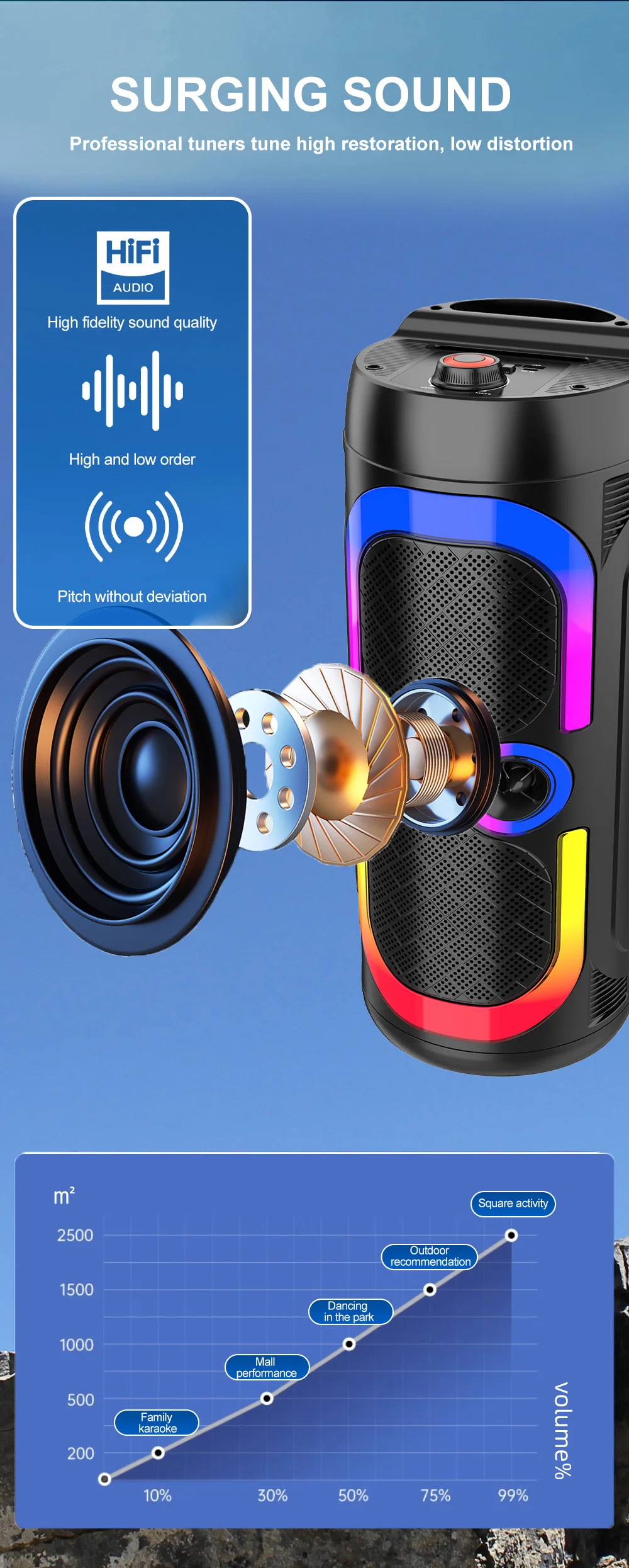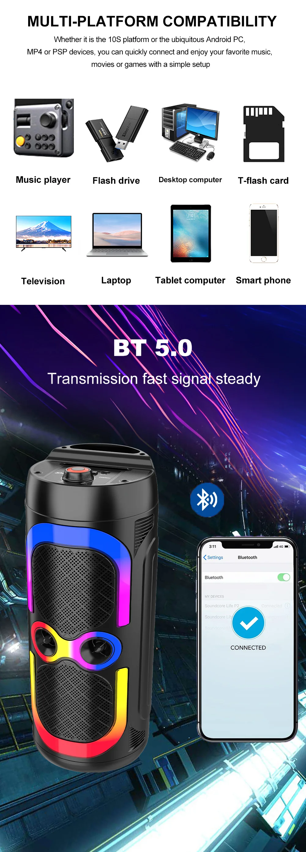 Grâce à sa connectivité Bluetooth stable, il se connecte facilement à vos smartphones, tablettes ou ordinateurs pour diffuser vos playlists préférées. Sa puissance stéréo assure un son clair et profond, adapté aussi bien aux environnements intérieurs (maison, hôtel, école) qu’aux espaces extérieurs.