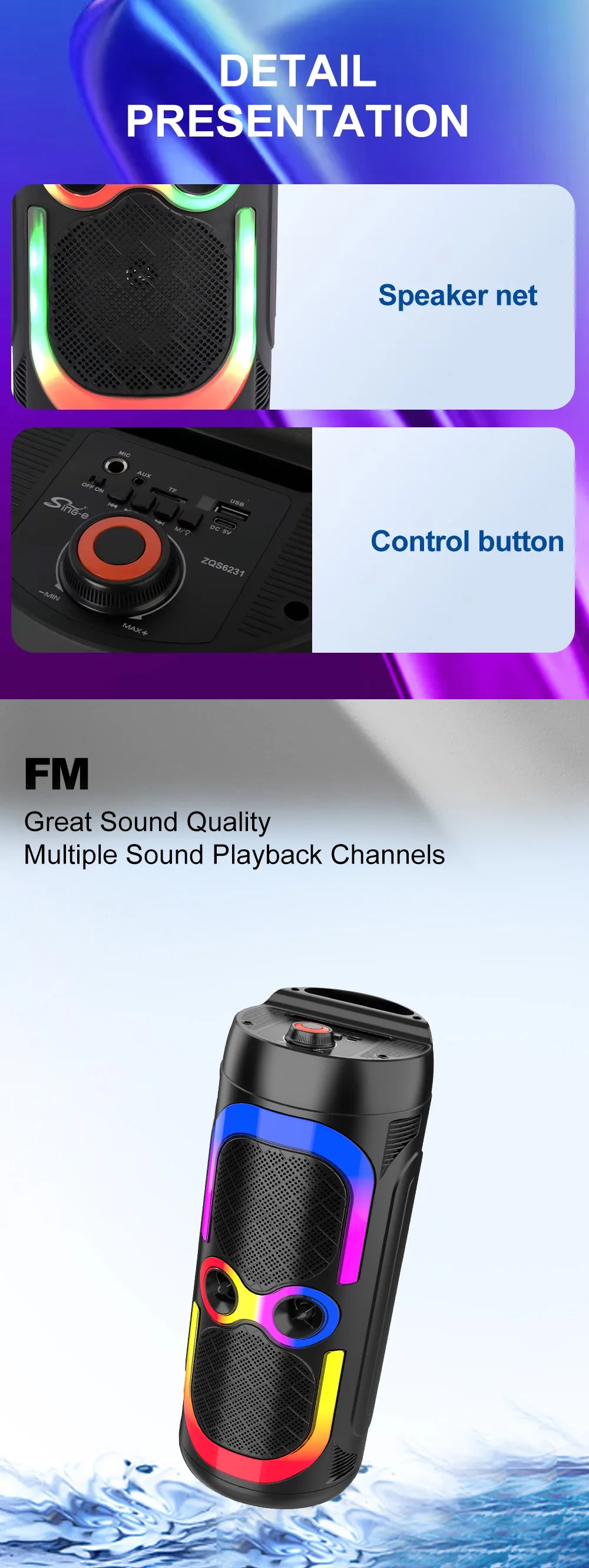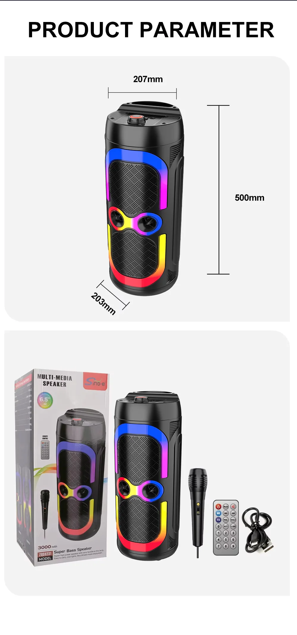 Le SING-E ZQS6231 est un haut-parleur DJ Bluetooth 6.5 pouces alliant puissance sonore et effets lumineux spectaculaires. Avec son woofer stéréo intégré et ses lumières froides RGB, il crée une ambiance immersive parfaite pour vos fêtes, événements et soirées à domicile.