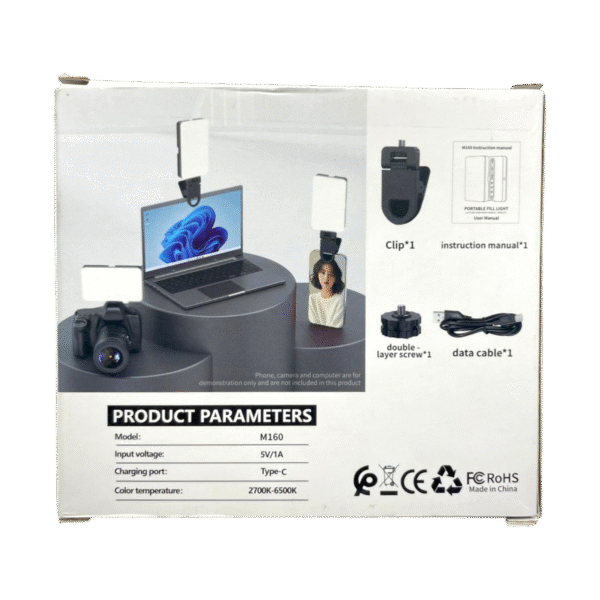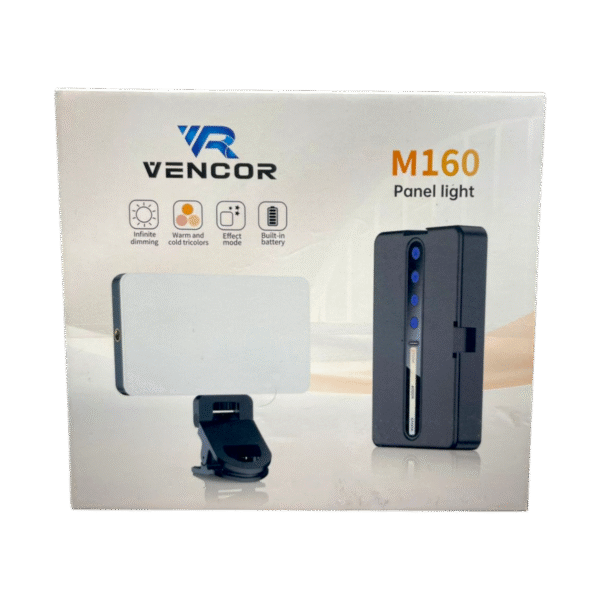 La VENCOR M160 est une lampe LED portable rechargeable avec luminosité réglable et température de couleur 2700K–6500K. Idéale pour streaming, TikTok, YouTube et visioconférences, elle offre un éclairage puissant, uniforme et professionnel dans un format compact avec charge USB-C.